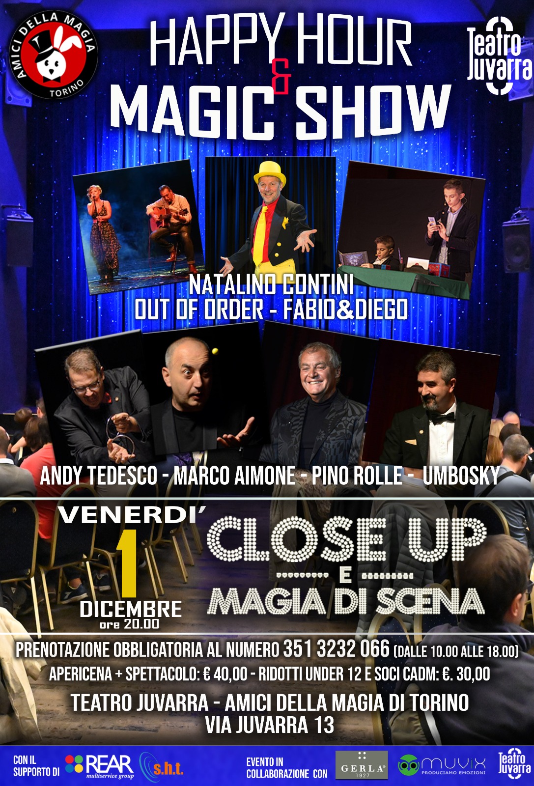 Torna lo spettacolo preceduto da Apericena! Venerdì 1° dicembre dalle 20 una speciale serata al Teatro Juvarra con lo spettacolo di Close Up e Magia da Scena il formato unico che caratterizza il circolo torinese. Il servizio di ristorazione è curato da Gerla 1927.