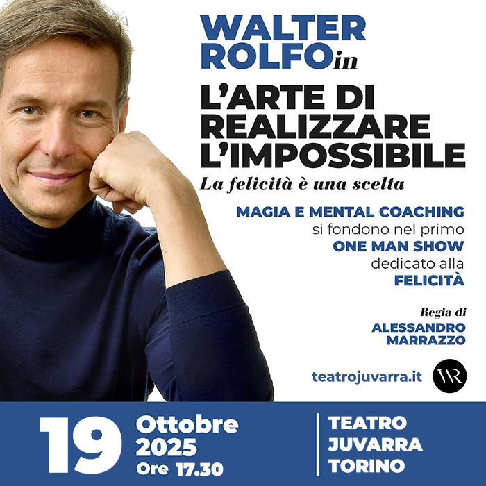 Domenica 19 ottobre alle 17.30 il Circolo Amici della Magia di Torino è lieto di ospitare al Teatro Juvarra Walter Rolfo, esperto di illusionismo, mental coaching e comunicazione, con il suo innovativo spettacolo L’arte di realizzare l’impossibile. Un evento unico nel suo genere che unisce magia, crescita personale e tecniche di pensiero laterale illusionistico per esplorare i limiti della nostra mente e scoprire come superarli. Quante volte abbiamo rinunciato a un sogno, un progetto o una relazione pensando che fosse fuori dalla nostra portata?