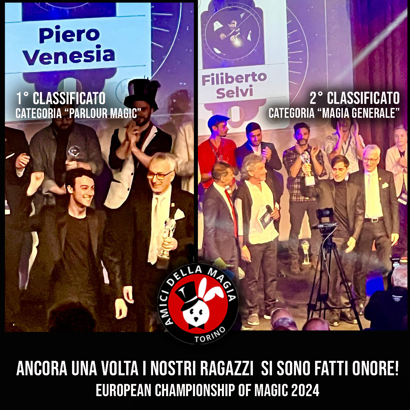Filiberto Selvi e Piero Venesia, due ragazzi figli del Laboratorio del Circolo Amici della Magia di Torino diretto da Tiziano Berardi! Anche stavolta il lavoro, la dedizione, la qualità e la storia del nostro Circolo hanno lasciato il segno ai Campionati Europei di Magia! Bravi ragazzi!